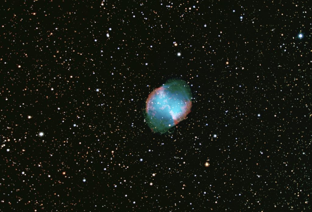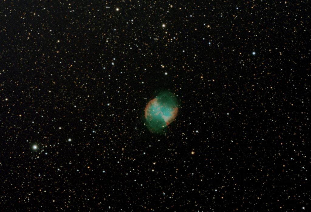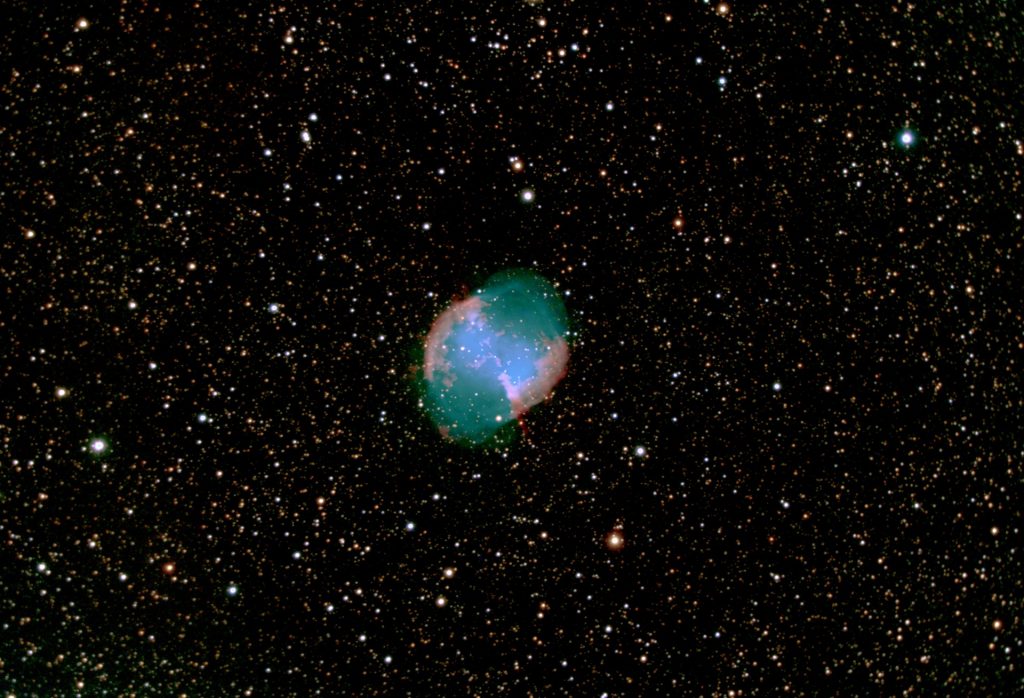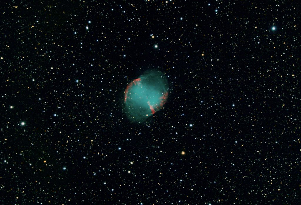 Messier 27 oder auch NGC 2853 wird auch wegen seiner Form Hantelnebel oder Dumbell Nebel genannt. Er ist ein Planetarischer Nebel in rund 1300 Lichtjahren Entfernung im Sternbild Fuchs. Seine Hülle dehnt sich vom Weißen Zwerg, der eine scheinbare Helligkeit von 14mag hat, mit einer Geschwindigkeit von etwa 30km/s was ein alter von ungefähr 10.000 Jahren ergibt. Er hat eine scheinbare Helligkeit von 7,5mag und eine Winkelausdehnung von 8′ x 5,7′.