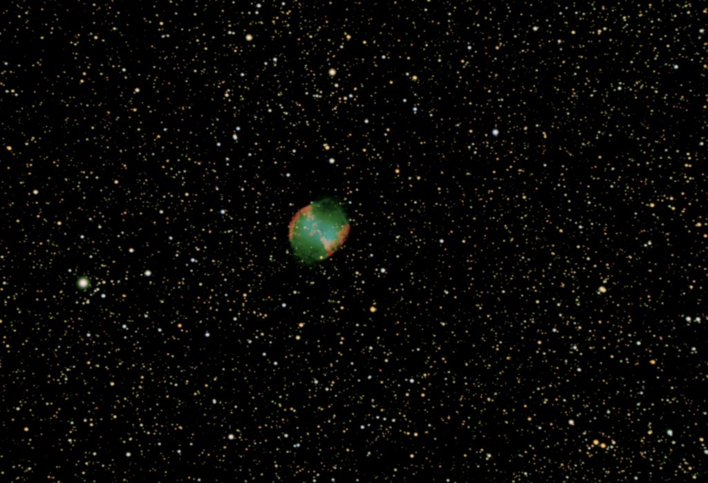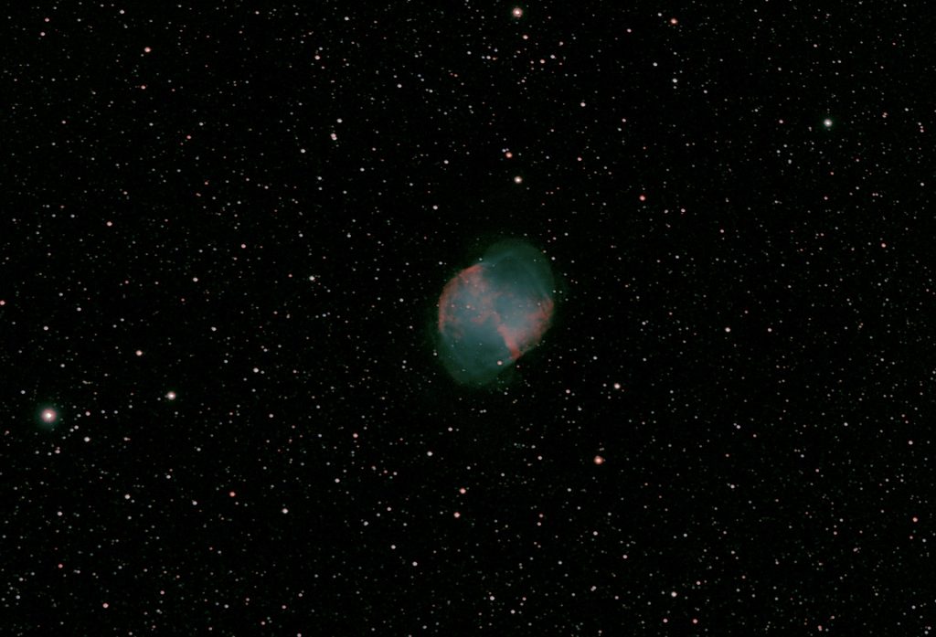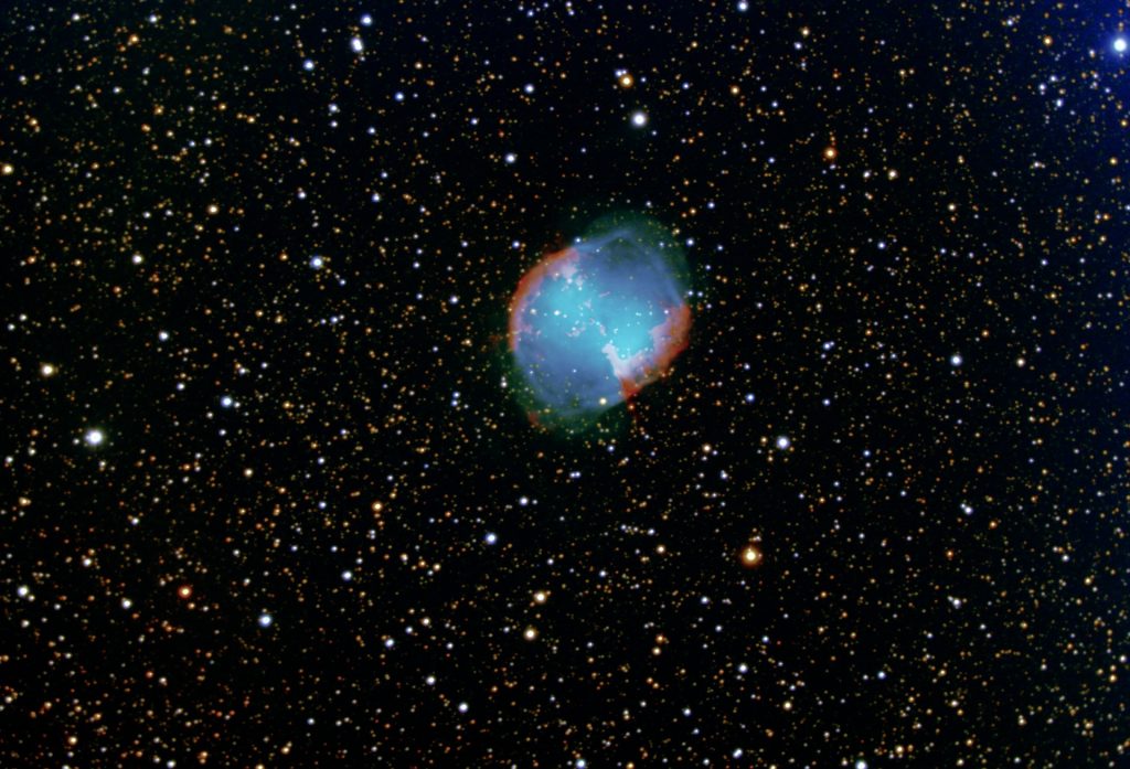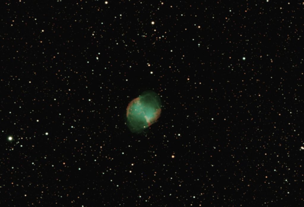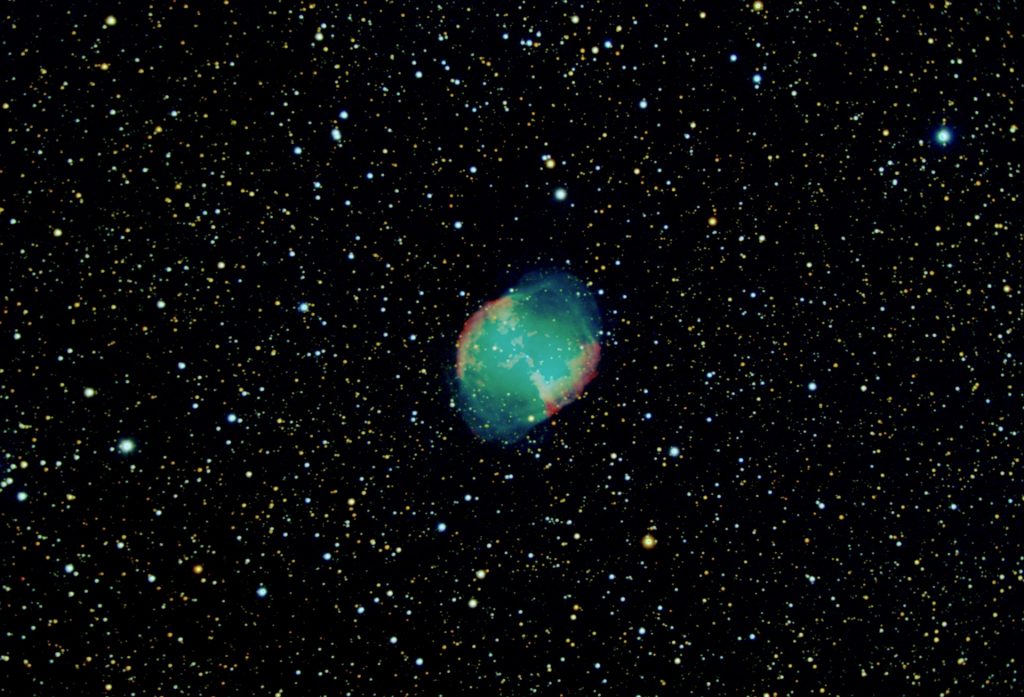 Messier 27 oder auch NGC 2853 wird auch wegen seiner Form Hantelnebel oder Dumbell Nebel genannt. Er ist ein Planetarischer Nebel in rund 1300 Lichtjahren Entfernung im Sternbild Fuchs. Seine Hülle dehnt sich vom Weißen Zwerg, der eine scheinbare Helligkeit von 14mag hat, mit einer Geschwindigkeit von etwa 30km/s was ein alter von ungefähr 10.000 Jahren ergibt. Er hat eine scheinbare Helligkeit von 7,5mag und eine Winkelausdehnung von 8′ x 5,7′.