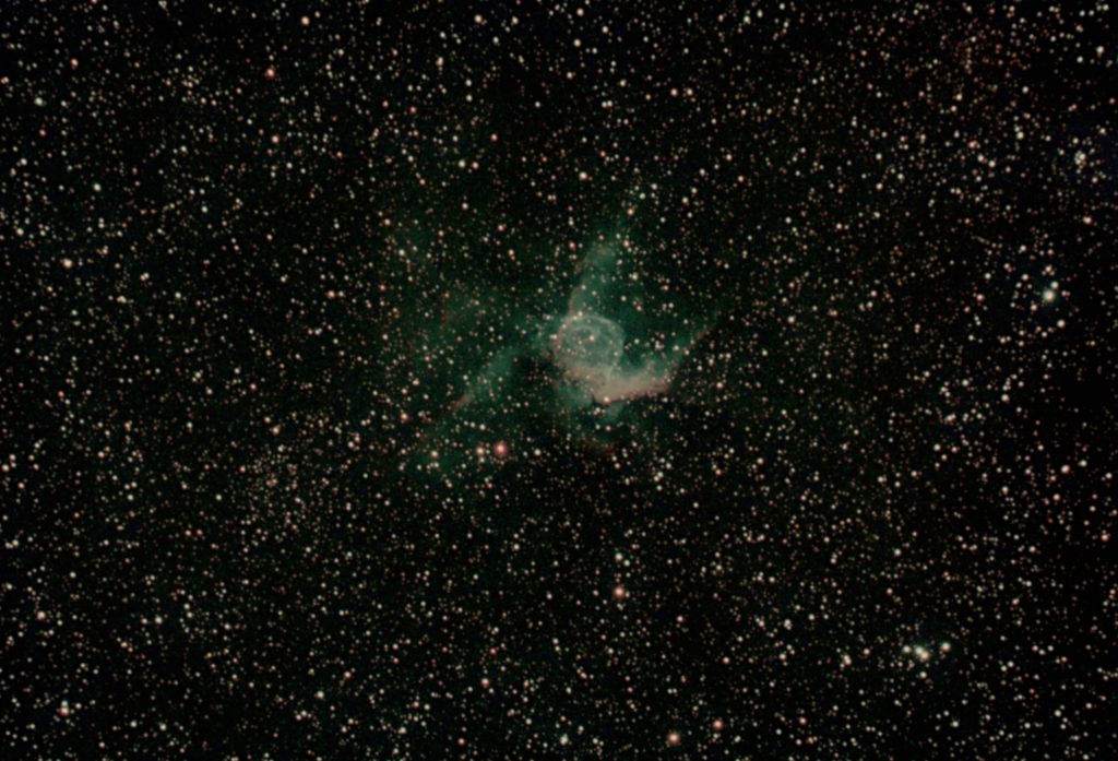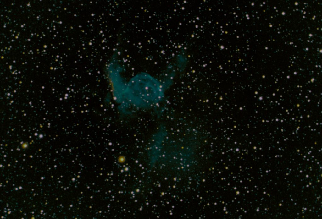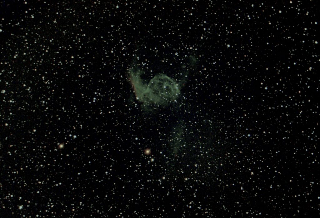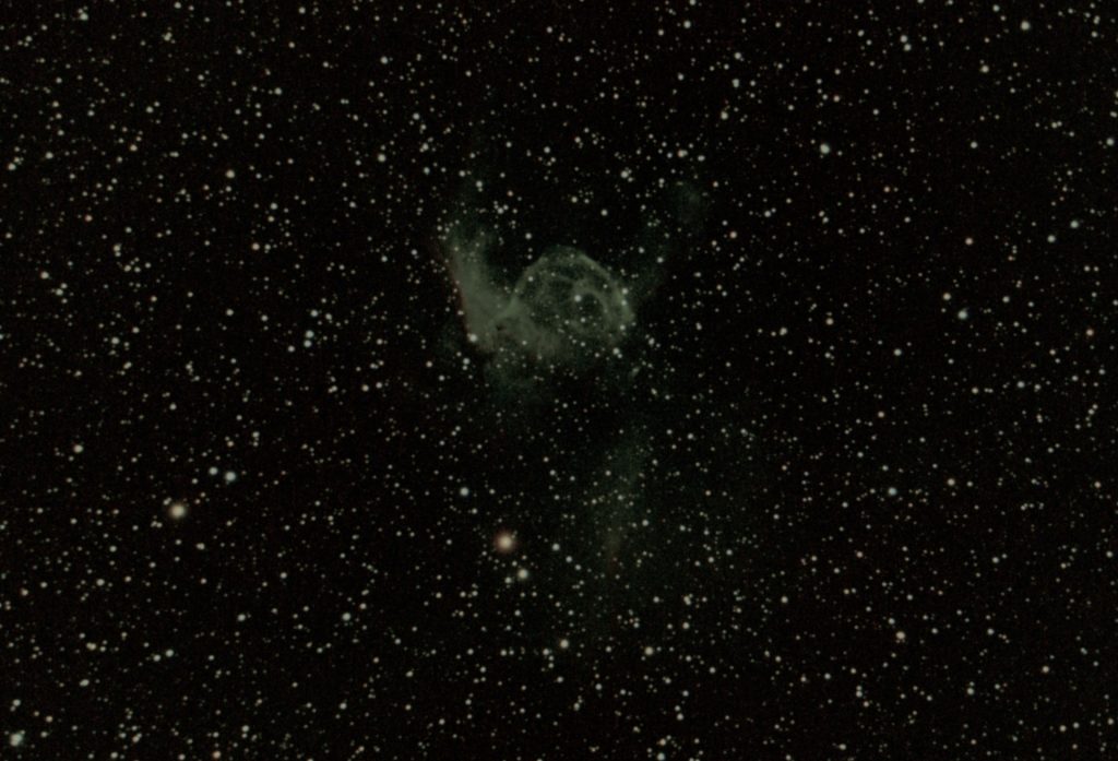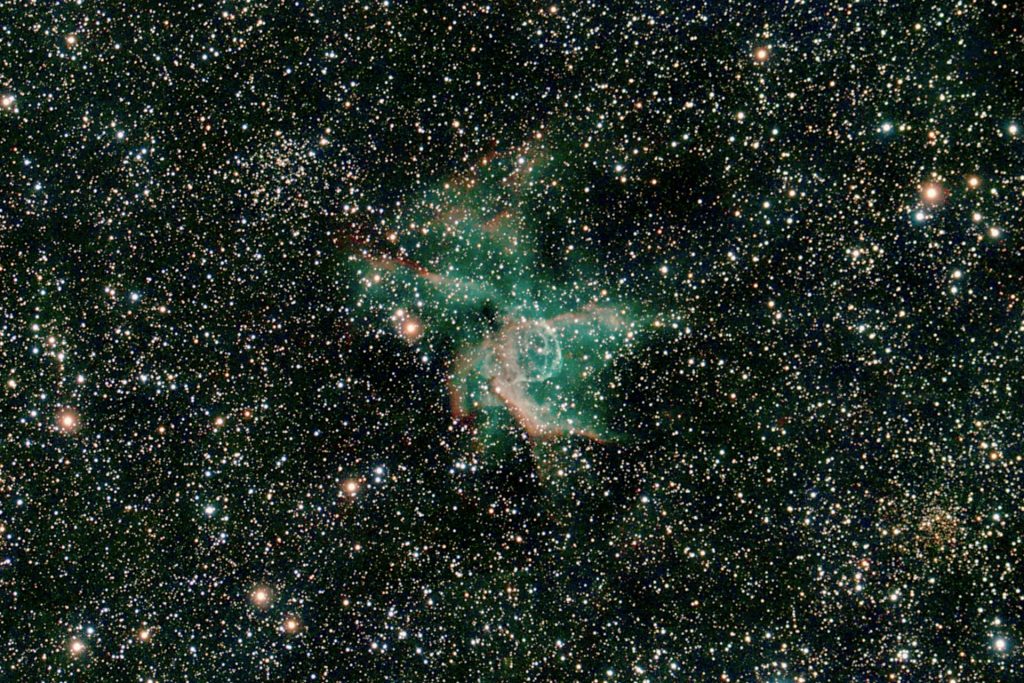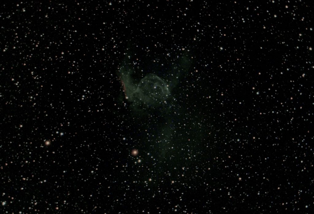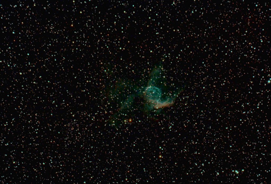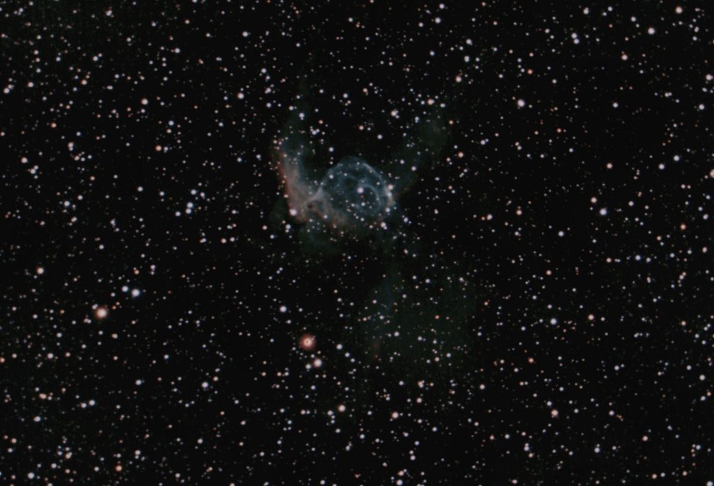 NGC 2359 im Sternbild Großer Hund wird auch als Entennebel oder öfter als Thor Helm bezeichnet. Bei ihm handelt es sich um eine Wolf-Rayet-Nebel in einer Entfernung von ungefähr 15 000 Lichtjahren und einer Ausdehnung von etwa 20 Lichtjahren. Der 14,4mag helle und ca 50.000 ° heiße Wolf-Rayet-Stern bläßt durch seinen hohen Strahlungsdruck seine Hülle mit rund 26km/s in das interstellare Medium. Die scheinbare Helligkeit des Nebels beträgt 11,4 mag und er hat eine Winkelausdehnung von 9′ x 6′.